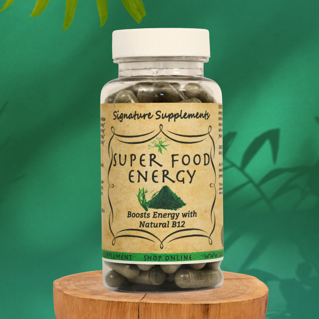 Our Super Foods Energizer formula features a blend of plant-based ingredients traditionally used in nutritional support blends. It includes green tea, a natural source of caffeine and catechins, along with ginseng, chlorella, spirulina, and alfalfa, which are known for their naturally occurring phytonutrients. Encapsulated for measured intake, this supplement contains no artificial fillers, colors, or preservatives.