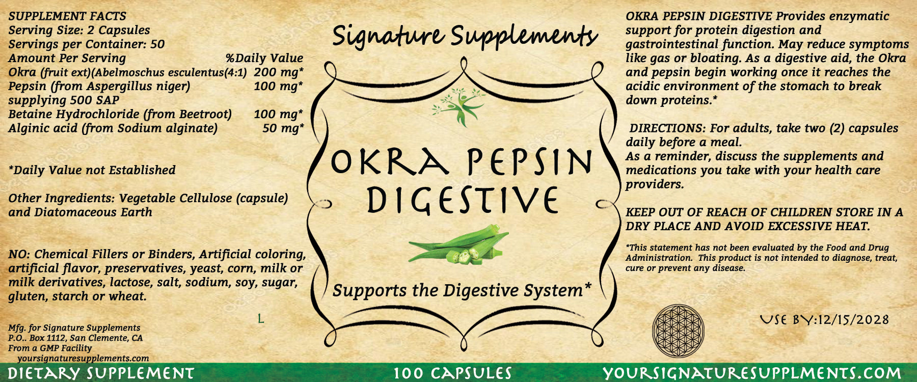 Provides enzymatic support for protein digestion and gastrointestinal function. May reduce symptoms like gas or bloating. As a digestive aid, the Okra and pepsin begin working once it reaches the acidic environment of the stomach to break down proteins. For intestinal cleaning and mucosal repair, it is designed to be taken consistently. Okra helps pepsin enzyme adhere to the intestinal wall, aiding in the breakdown of mucous and improve nutrient absorption.